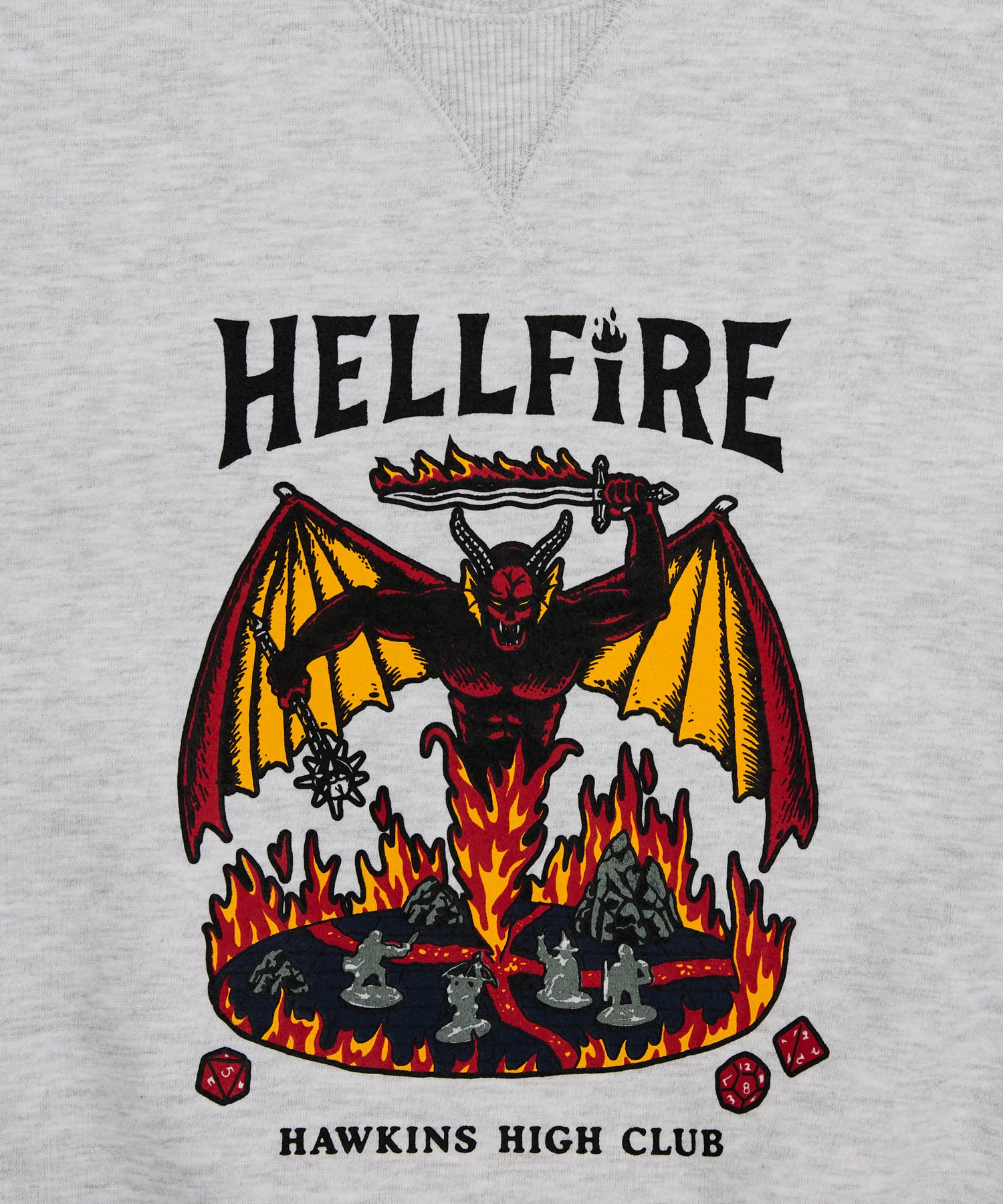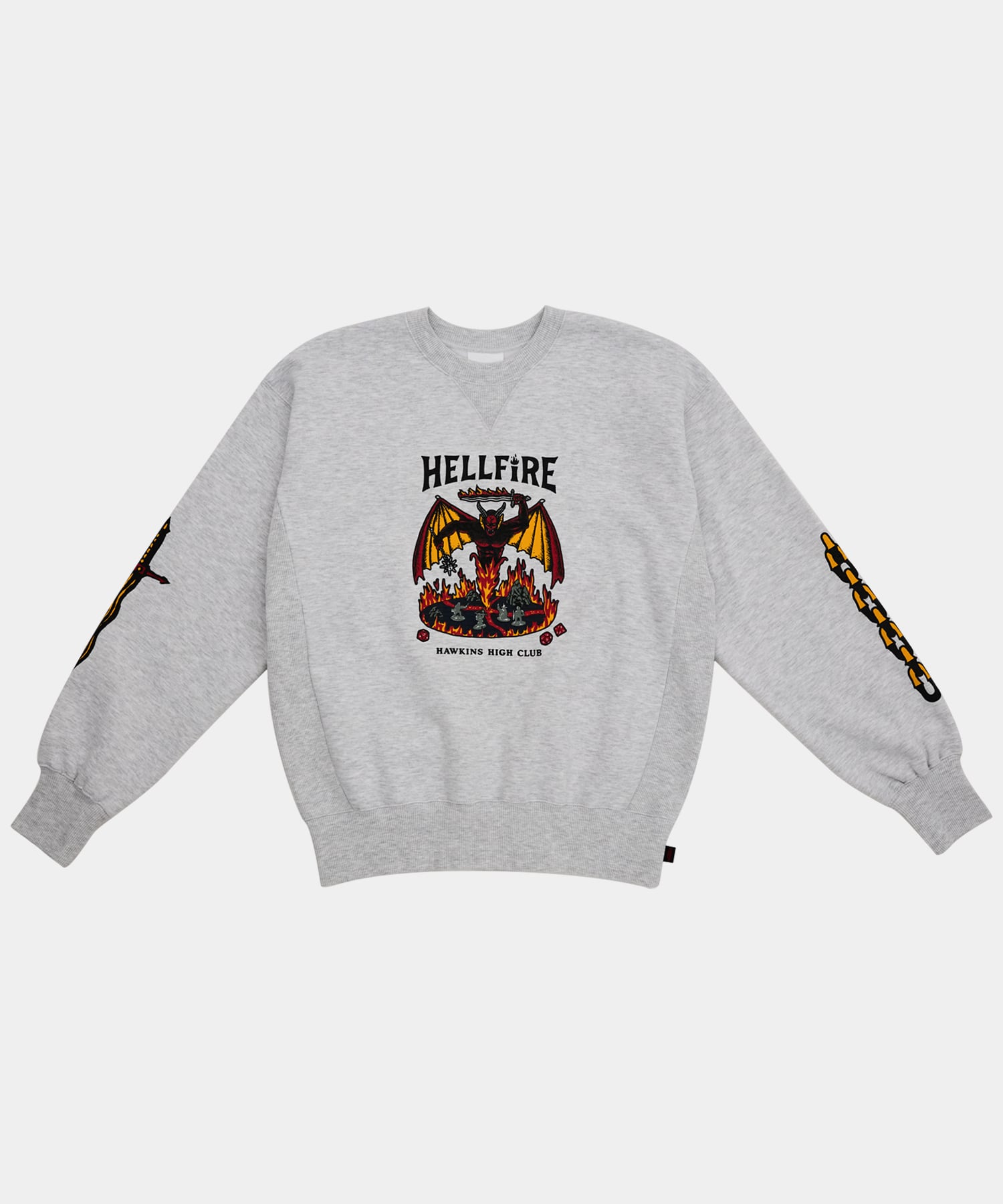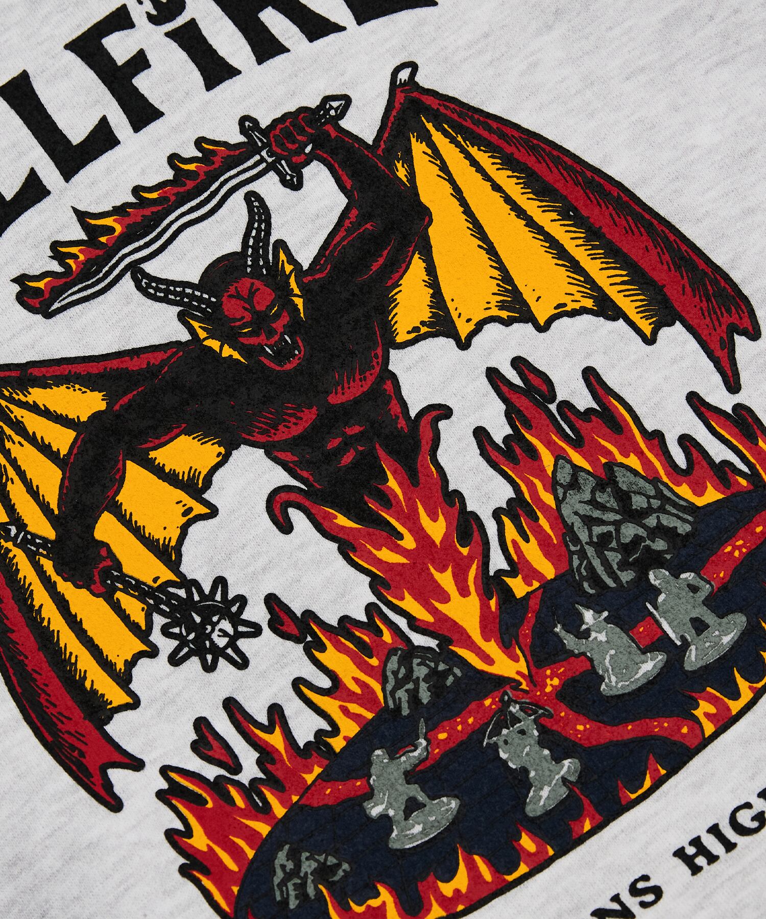 両袖にはHellofire Clubのグラフィックをプリント、ネックラインにはV字のガゼットを施しており、首まわりの伸びを抑える実用的な仕様に。